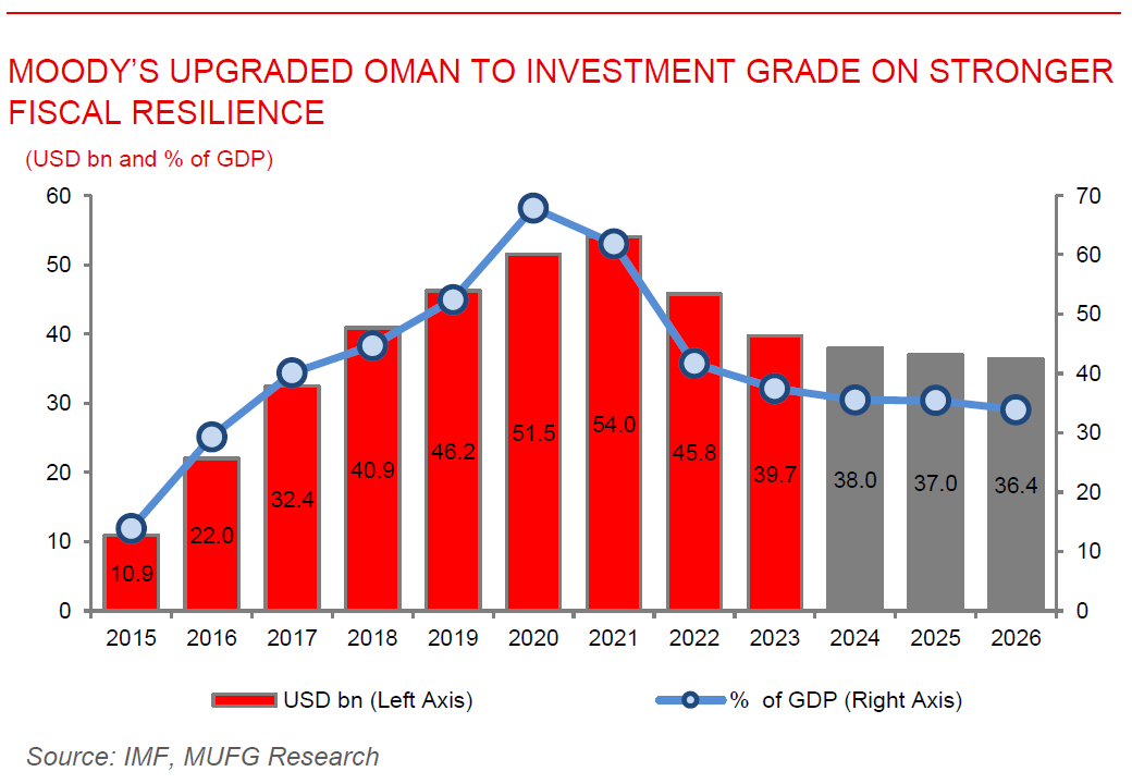 Moody’s upgraded Oman to investment grade on stronger fiscal resilience. Moody’s has upgraded Oman’s credit rating to ‘Baa3’ from ‘Ba1’, returning it to investment-grade status with a stable outlook. The upgrade reflects Oman’s significantly improved fiscal metrics, with government debt falling to 35.5% of GDP in 2024, down from 37.5% in 2023 and over 60% in 2020, alongside reduced spending levels and a fiscal breakeven oil price now below USD70/b. Moody’s expects debt metrics to remain strong even if oil prices fall below USD65/b, supported by gradual non-oil revenue growth and fiscal reforms. While diversification efforts are progressing, risks remain due to Oman’s heavy reliance on hydrocarbons and exposures to global energy transition pressures.