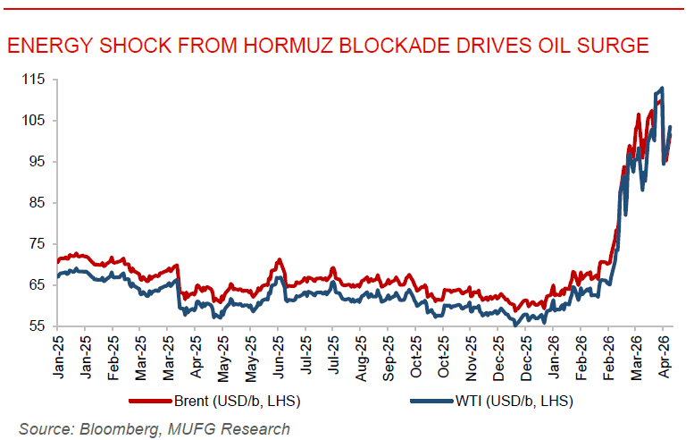 Energy shock from Hormuz blockade drives oil and gas surge. Oil and natural gas prices spiked sharply after the Strait of Hormuz blockade by the US, following failed negotiations between the US and Iran. Brent surged over 9% toward USD104/b, while European gas jumped nearly 18%, as the blockade, targeting vessels linked to Iranian ports, tightened already strained supply chains. The ongoing Middle East conflict has disrupted energy flows, prompting a scramble for crude cargoes and raising inflation and growth concerns worldwide. Trump signalled further escalation, including potential strikes, while Iran has maintained partial oil exports, primarily to China, despite reduced volumes. Risks of broader disruption loom, with possible Houthi attacks at Bab el-Mandeb threatening Red Sea transit, even as Saudi Arabia restores pipeline capacity. The situation underscores mounting geopolitical tension, stalled nuclear talks, and the potential for prolonged supply shocks highlighted by OPEC.