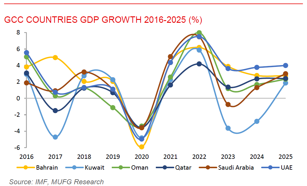 Bahrain’s economy records steady Q1 2025 growth on non-oil strength. Bahrain’s real GDP expanded by 2.7% y/y in Q1 2025, driven by a 2.2% rise in non-oil activities and a robust 5.3% increase in the oil sector, according to official data. The non-oil economy remained dominant, contributing 84.8% to real GDP, supported by strong performances in accommodation and food services, financial and insurance activities, and construction. Foreign direct investment stock climbed 3.5% to BHD17.1bn (USD45.3bn), reflecting sustained investor confidence. Inflation remained muted at 0.1%, aided by proactive government measures to curb global supply chain pressures. Bahrain’s growth trajectory is in line with GCC peers, with the IMF forecasting regional GDP to reach 3.0% in 2025 and 4.1% in 2026, signalling a positive outlook.