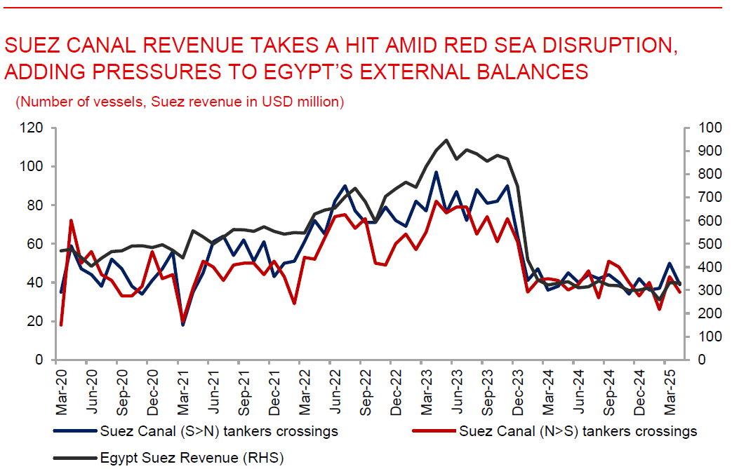 Egypt’s economy stabilises under IMF program, but structural reforms remain crucial. In its fourth review of Egypt’s Extended Fund Facility (EFF), the IMF noted clear signs of macroeconomic stabilisation, including a rebound in GDP growth to 3.5% in early FY2024/25 and a decline in inflation from a peak of nearly 38% in 2023 to 13.9% in April 2025. However, external vulnerabilities remain significant, with the current account deficit widening due to a sharp drop in Suez Canal revenues, down USD6bn from Red Sea disruptions, and continued refugee inflows from Sudan, which exceeded 600,000 by end-2024. While the IMF welcomed recent policy improvements, it stressed that lasting progress hinges on accelerating structural reforms. The approval of an additional USD1.3bn under the Resilience and Sustainability Facility (RSF), alongside the USD1.2bn EFF disbursement, gives Egypt needed financial support to pursue these reforms and build long-term resilience.