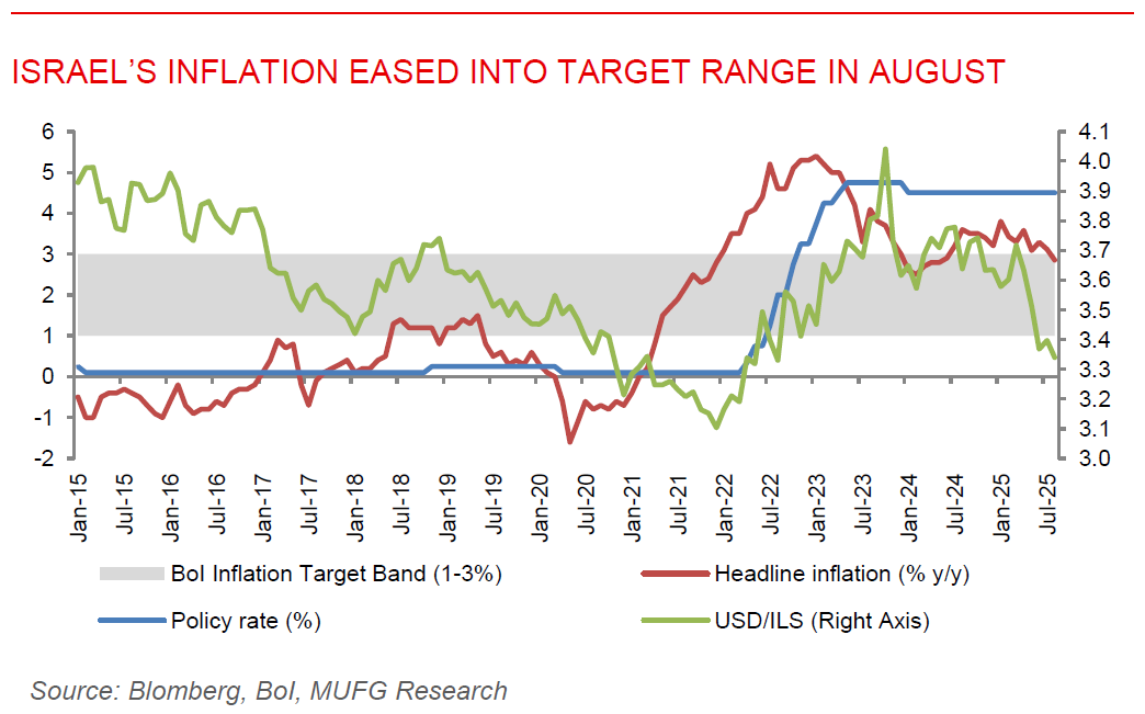 Israel’s inflation eased into target range in August. Israel’s CPI fell to 2.9% y/y in August from 3.1% y/y in July, marking the first time in over a year that inflation has fallen within the government’s 1-3% target range. The moderation reflects declines in categories such as fresh fruit, clothing, and furniture, though pressures persisted in foreign travel, entertainment, transportation, and fresh vegetables, alongside continued increases in housing-related costs. The return of annual inflation to target provides some relief after a prolonged period of elevated price growth and could give the Bank of Israel (BoI) more room to adjust its monetary stance in the months ahead. Going forward, an interest rate cut is unlikely in the near term, and policymakers are likely to remain cautious given underlying price pressures in housing and services.