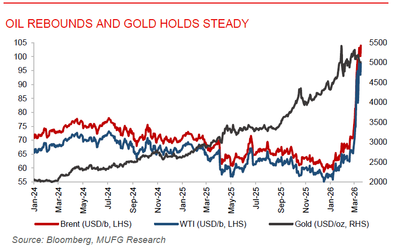 Oil rebounds as Iran escalates attacks on Gulf energy infrastructure. Oil prices rose after a brief decline, with Brent climbing above USD103/b and WTI near USD96/b, Iran intensified attacks on energy infrastructure across the Persian Gulf. Drone and missiles strike hit key sites including the UAE’s Shah field, as Iraqi oil field, and a major Emirati port, worsening concerns over already strained global supply. The conflict, now in its third week, has nearly halted shipping through the Strait of Hormuz, significantly impacting energy flows, especially Asia, and pushing oil prices up more than 40% since the war began. While prices dipped earlier amid plans for a US emergency reserve release, renewed geopolitical risks supported the rebound. President Trump has threatened broader strikes on Iran’s oil infrastructure and is urging international support to secure Hormuz, even as the US allows limited Iranian crude shipments to continue. Meanwhile, Gulf producers are cutting output and seeking alternative export routes, highlighting growing uncertainty over supply stability if disruptions persist.