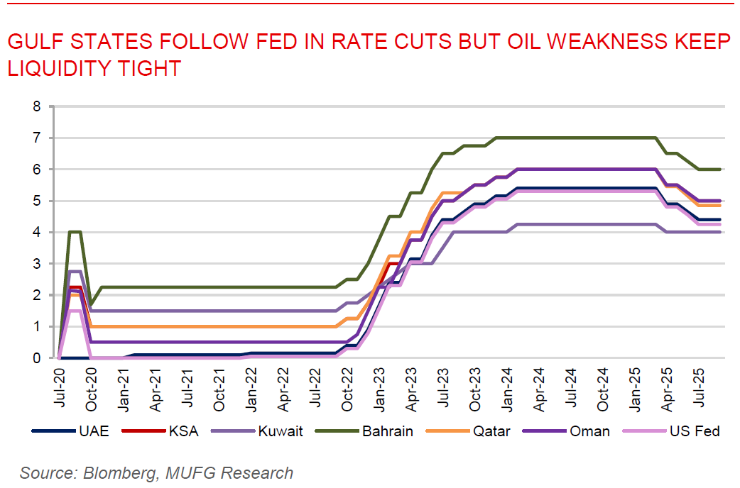 Gulf states follow Fed in rate cuts but oil weakness keep liquidity tight. Arab Gulf countries moved in lockstep with the US Fed’s first 25bps rate cut of the year, reflecting their currency pegs and dollar-linked monetary frameworks, but the impact may be modest given the region’s deeper reliance on oil revenues. The UAE cut its base rate, Saudi Arabia reduced both repo and reverse repo rates, Kuwait lowered its discount rate, Qatar trimmed its repo, lending, and deposit rates, while Bahrain and Oman each eased overnight or repo rates by the same margin. These moves, while providing some relief to credit demand and the housing sector, come against the backdrop of Brent crude averaging around USD67/b, below fiscal breakeven levels for several countries, particularly Saudi Arabia. Lower oil receipts have constrained domestic liquidity, with the Saudi interbank rate hovering above 5%, a level not seen since before the global financial crisis and even higher than during the 2020 oil crash. While a single rate cut is unlikely to meaningfully shift the liquidity picture, the Gulf’s alignment with the Fed signals the start of a monetary easing cycle, which could gradually bolster demand in interest-sensitive sectors such as housing and real estate, even as broader financial conditions remain closely tied to the trajectory of global oil markets.