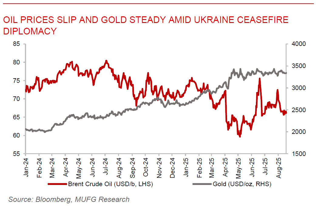 Oil prices slip amid Ukraine ceasefire diplomacy. Oil prices slipped as traders assessed the implications of intensifying diplomatic efforts toward a Ukraine ceasefire, with Brent falling toward USD66/b and WTI near USD63/b, retracing after recent gains. US President Trump urged Russian President Putin to prepare for a direct summit with Ukraine President Zelenskiy following high-level talks in Washington, signalling the most concrete push yet toward peace. While any ceasefire could pave the way for higher Russian oil exports, fuelling oversupply concerns at a time when OPEC+ is already restoring production, persistent conflict risks remain evident as Ukraine targeted Russia’s pipeline, temporarily disrupting flows critical to Central Europe. With oil still down over 10% YTD on trade policy uncertainty and rising output, investors are also watching sanctions closely, as Trump tightened penalties on India for Russian oil purchases while sparing China, the largest buyer.