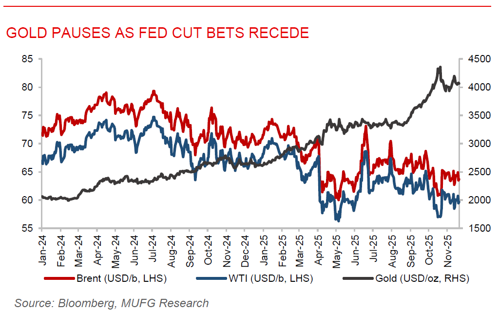 Gold pauses as Fed cut bets recede and dollar strengthens. Gold held steady near USD4,075/oz after two days of gains as investors reduced expectations for a December Fed rate cut. With the October US jobs report withhold and Fed minutes showing broad support for keeping rates unchanged through 2025, gold faces headwinds from steady policy and a stronger dollar, which saw its biggest jump since September. Still, gold remains up more than 50% this year, supported by earlier Fed easing, stronger central bank buying and continued ETF inflows. Looking ahead, traders will focus on upcoming US data, Fed communication, and currency moves to gauge whether gold can sustain its strong momentum into year-end.