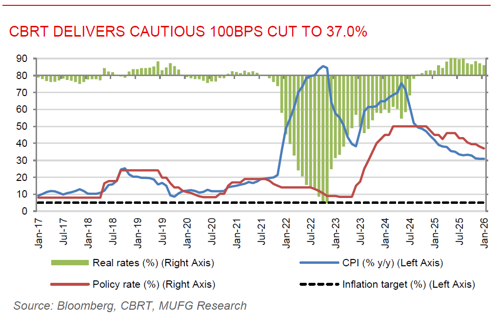 CBRT delivers cautious 100bps cut as inflation risks temper easing pace. Turkey’s Central Bank (CBRT) cut its kept policy rate by 100bsps to 37.0%, a smaller move than expected, signalling a more cautious approach amid near-term inflation risks. While the central bank acknowledged that the underlying inflation trend eased in December, it flagged firmer monthly inflation in January, driven mainly by food prices, and noted that demand is still supporting disinflation but at a slowing pace. The decision suggest policymakers are placing greater weight on inflation risks, including the impact of a 27% minimum wage hike and uncertainty around upcoming CPI methodology changes. Despite the slower start, expectations remain for inflation to improve in February and March, supporting a larger 150bps cut at the March meeting and a policy rate of 28.5% by year-end, though risks are skewed to the upside. From a strategy perspective, the cautious cut reinforces confidence in maintaining tight conditions for now, supporting a short USD/TRY stance while awaiting clear inflation signals before entering duration trades.