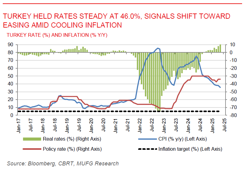Turkey held rates at 46.00%, signals possible cuts amid easing inflation. Central Bank of Turkey (CBRT) held its key interest rate steady at 46.00%, but signalled possible rate cuts if inflation keeps falling and geopolitical risks ease. Inflation slowed to 35.4% in May, with further easing expected. The CBRT cited weakening domestic demand and dropped previous tightening language. The move follows a surprise 350bps hike in April and comes amid concerns over rising oil prices due to the Israel-Iran conflict, which could challenge the bank’s 24.0% year-end inflation target. Looking ahead, the CBRT is likely to remain data-dependent, we view the CBRT will restart its cutting cycle in July when inflation will have fallen to 32.0% y/y (based on our estimates), providing an adequate real rate buffer.
