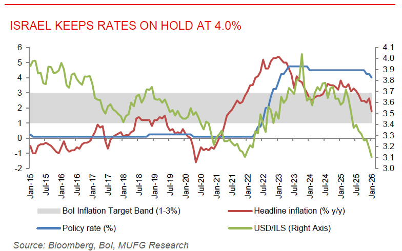 Israel keeps rates on hold at 4.0% as geopolitical risks weigh on outlook. Bank of Israel (BoI) left its benchmark interest rate unchanged at 4.0%, pausing after two consecutive cuts as policymakers opted for caution amid heightened geopolitical uncertainty surrounding a potential US military strike on Iran. Although inflation has eased to 1.8%, comfortably within the 1-3% target range, and economic growth remains solid, with GDP expanding 4% in the 4Q 2025, the BoI cited rising risk premiums and regional tensions as key reasons for holding rates steady. Officials noted that while inflation continues to moderate and economic activity is expanding above trend, uncertainty linked to Iran tensions, fiscal developments, and potential retaliation risks warranted a wait-and-see approach. The decision divided economists and drew criticism from Finance Minister Bezael Smotrich, who argued that lower borrowing costs are needed to support growth and ease credit conditions. However, with US-Iran negotiations ongoing, a large American military presence in the region, and domestic political uncertainty over Israel’s pending budget, the central bank signalled it would keep further rate decisions data-dependent while prioritising financial and macroeconomic stability.