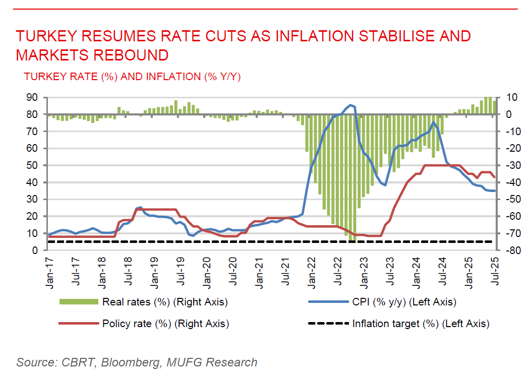 Turkey resumes rate cuts as inflation stabilise and markets rebound. The Central Bank of Turkey (CBRT) resumed its easing cycle for the first time since March, cutting the one-week repo rate by 300bps to 43.0%, signalling growing confidence in the country’s macroeconomic stability amid easing inflation and recovering markets. The CBRT officials noted that future cuts will be assessed on a meeting-by-meeting basis, emphasising that monetary policy will remain tight until price stability is firmly anchored. June inflation eased more than expected to 35.1% y/y, bringing it closer to the bank’s year-end target of 24%, while Turkish assets have rallied following a politically turbulent spring. The bank also reduced the overnight lending and borrowing rates and forecast a temporary inflation uptick in July due to tax increases. While markets welcomed the move, with equities rising and bond yields easing, lingering political uncertainties continue to present downside risks to Turkey’s investment outlook.