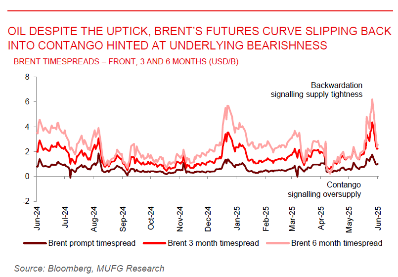 Oil rebounded slightly after sharp selloff, but market remains cautious. Oil prices edged higher about 1% to nearly USD68/b, recovering modestly after a steep 13% two-day drop, the worst since 2022. The bounce came as traders reassessed the Iran-Israel ceasefire and digested reports of a 4.3 million barrel decline in US crude stockpiles. Still, sentiment remained fragile. Earlier optimism around the truce was complicated by President Trump’s mixed signals, allowing China to resume Iranian oil imports while insisting sanctions remain. The slight rebound was seen as a technical correction rather than a shift in trend, with focus now turning to broader economic signals, upcoming US tariff deadlines, and the next OPEC+ meeting on 6 July. Despite the uptick, Brent’s futures curve slipping back into contango hinted at underlying bearishness.