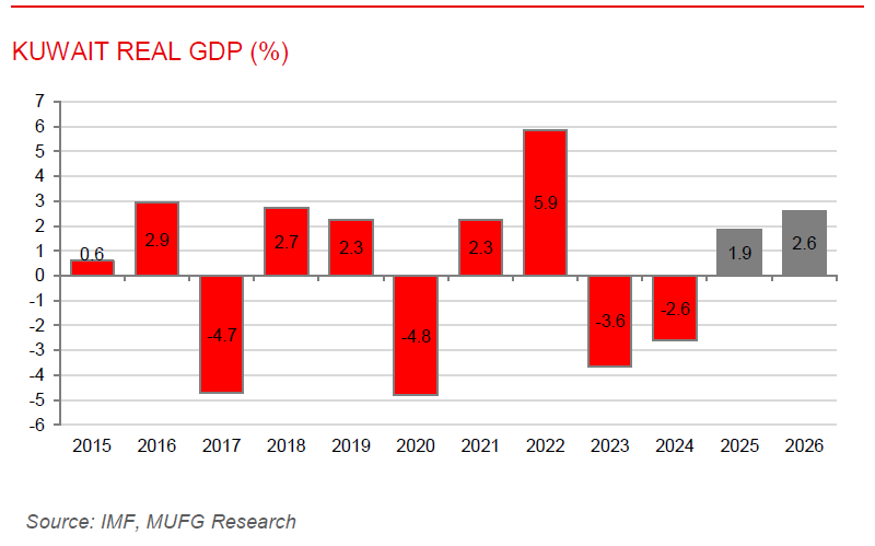 IMF Notes Kuwait’s recovery amid reform push. An IMF mission to Kuwait reported that the economy is recovering after last year’s contraction, with real GDP projected to expand 2.6% in 2025 on the back of higher oil output following the unwinding of OPEC+ cuts and stronger non-oil growth of 2.7% supported by resilient domestic demand. Inflation continues to moderate, falling from 2.9% in 2024 to a projected 2.2% in 2025, but lower oil prices are expected to widen the fiscal deficit to 7.8% of GDP in FY2025/26 and narrow the current account surplus to 26.5% of GDP. Financial stability remains intact, with solid bank capital and liquidity buffers, low non-performing loans, and accelerating private-sector credit growth. Risks to the outlook are broadly balanced but remain heavily tied to oil price volatility and OPEC+ production dynamics. On reforms, progress has been made with the extension of a 15% corporate income tax to large multinationals and the passage of a new Public Debt Law in March 2025, though the IMF stressed that faster fiscal and structural reform is needed to diversify the economy, enhance competitiveness, and sustain non-oil growth.