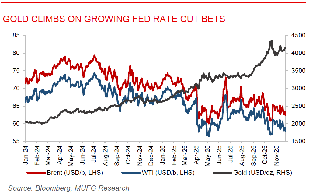 Gold rises as rate-cut expectations build on softer US data. Gold climbed toward USD4,165/oz, lifted by a weaker dollar and rising confidence that the Fed will cut interest rates before year-end. The latest batch of delayed US data strengthened the case for easing, with September retail sales showing signs of fatigue after months of strong consumer spending and confidence posting its steepest drop since April. The prospect of a policy shift gained additional traction as Kevin Hasset, widely viewed as the frontrunner to become the next Fed chair, is seen as aligned with President Trump’s support for lower borrowing costs. Gold has held comfortably above the USD4,000 mark, after retreating from its record high above USD4,380/oz last month and remains up more than 55% this year, supported by sustained central bank purchases and robust investor demand driven by currency-debasement concerns.