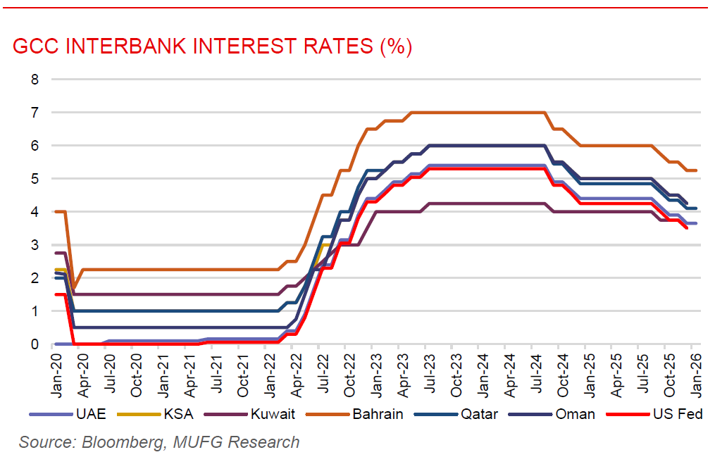 Gulf central banks maintain policy rate in line with Fed decision. Gulf central bank kept their key interest rates unchanged after the US Fed opted to hold policy rates steady, underscoring their commitment to monetary stability under dollar-pegged exchange rate frameworks. The Central Bank of the UAE (CBUAE) confirmed that the base rate applicable to the overnight deposit facility will remain at 3.65%, a level anchored to the Fed’s interest rate on reserve balances, which continues to guide the overall monetary policy stance and set an effective floor for overnight money market rates in the country. The CBUAE also kept the rate for borrowing short-term liquidity through all standing credit facilities unchanged at 50bps above the base rate, reinforcing policy transmission and liquidity management. Similarly, the Central Bank of Bahrain (CBB) decided to maintain its overnight deposit rate at 4.25% following its periodic review, citing the need to preserve monetary and financial market developments. In Qatar, the Qatar Central Bank (QCB) also opted to hold rates steady after evaluating domestic economic and monetary conditions, keeping the deposit rate at 3.85%, the lending rate at 4.35%, and the repo rate at 4.10%, which is used for short-term liquidity operations. The Fed’s decision itself was not unanimous, with two governors factoring a rate cut while the majority supported holding rates unchanged.