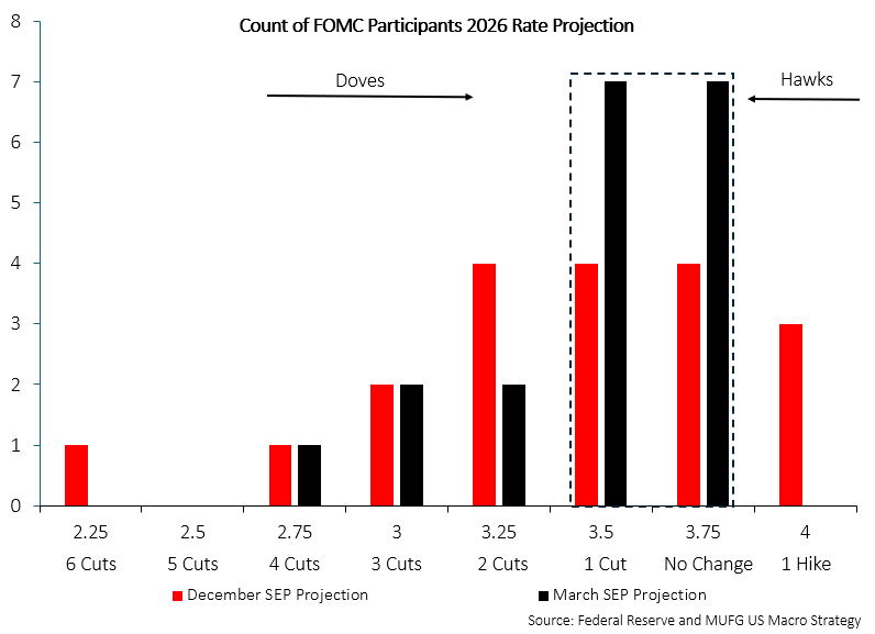 However, upon closer inspection (and as seen in the bar chart below) the interest rate dot forecasts show a convergence towards 1 cut in 2026, with the skew looking more hawkish as the doves pushed their dots up to suggest fewer cuts vs. December's projections. Chair Powell was not trying to sound hawkish, but the press contingent led him in that direction. In particular, when asked about "two-sided guidance on policy" where the Fed is discussing the risk of either cutting or hiking, Powell mentioned it came up again and that "hikes are not off the table."