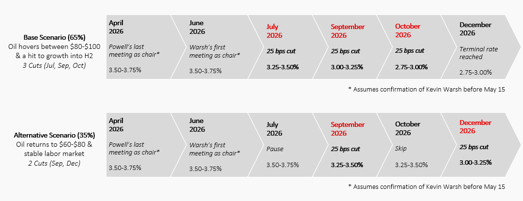 Fed View Update: We have been waiting to see the Fed's reaction to the latest conflict before changing our house view. We still think they needs to cut rates further to finish the normalization process before 2026 is over. To reiterate, we believe the Fed's view on the labor market is too sanguine and too focused on the labor supply side. We also view this conflict as another shock that will negatively impact the economy and corporate America's appetite to expand payrolls. The issue is that oil shocks are initially inflationary before becoming contractionary. Therefore, we anticipate the Fed will fall into the same trap as they did in 2025 (over tariff fears) by pushing back remaining cuts into the 2nd half. Based on our bearish leaning economic view, we still believe that the Fed will cut 3 times to/under neutral in 2026. However, if inflation remains sticky and jobs data stabilizes, the risk is that they only cut 2 times (see diagram below).
