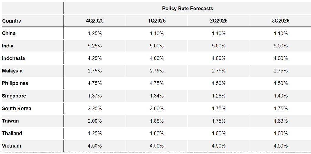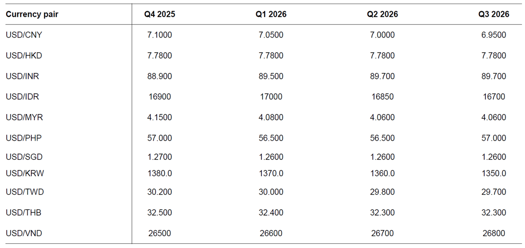 Asian economies showed mixed but generally resilient performance in the third quarter of 2025, amid various headwinds including diverging monetary policies, trade tensions and tariffs, and political events. Asia’s overall growth decelerated in Q3 from a strong Q2. Asian currency overall, measured by the Asia dollar index, weakened by 1.2% against the dollar this Q3, with KRW (-3.7%), INR (-3.5%) and PHP (-3.3%) being the laggard, and CNY (+0.6%) and HKD (+0.9%) being the out-performing ones. There was a certain level of disconnect between currency performances and individual country’s economic fundamentals in recent months. Delayed impact of tariffs, asset revaluation, and political events and etc can help to explain such gaps.