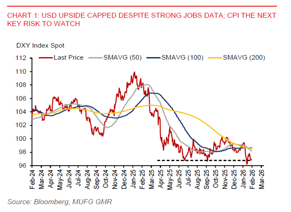 Focus now shifts squarely to the US CPI release later today, which is likely to be the next key catalyst for rates and FX markets. Our US strategist expects January core CPI to rise by 0.25%mom and 2.6%yoy, with base effects providing a notable lift to the annual print. Bloomberg consensus, by comparison, looks for 2.5%yoy for both headline and core CPI. From a market perspective, CPI would likely need to exceed market expectations to trigger a renewed hawkish repricing of the Fed rate path. Conversely, an outcome broadly in line with consensus, or softer, should allow markets to maintain expectations for around two Fed rate cuts this year, containing dollar upside.