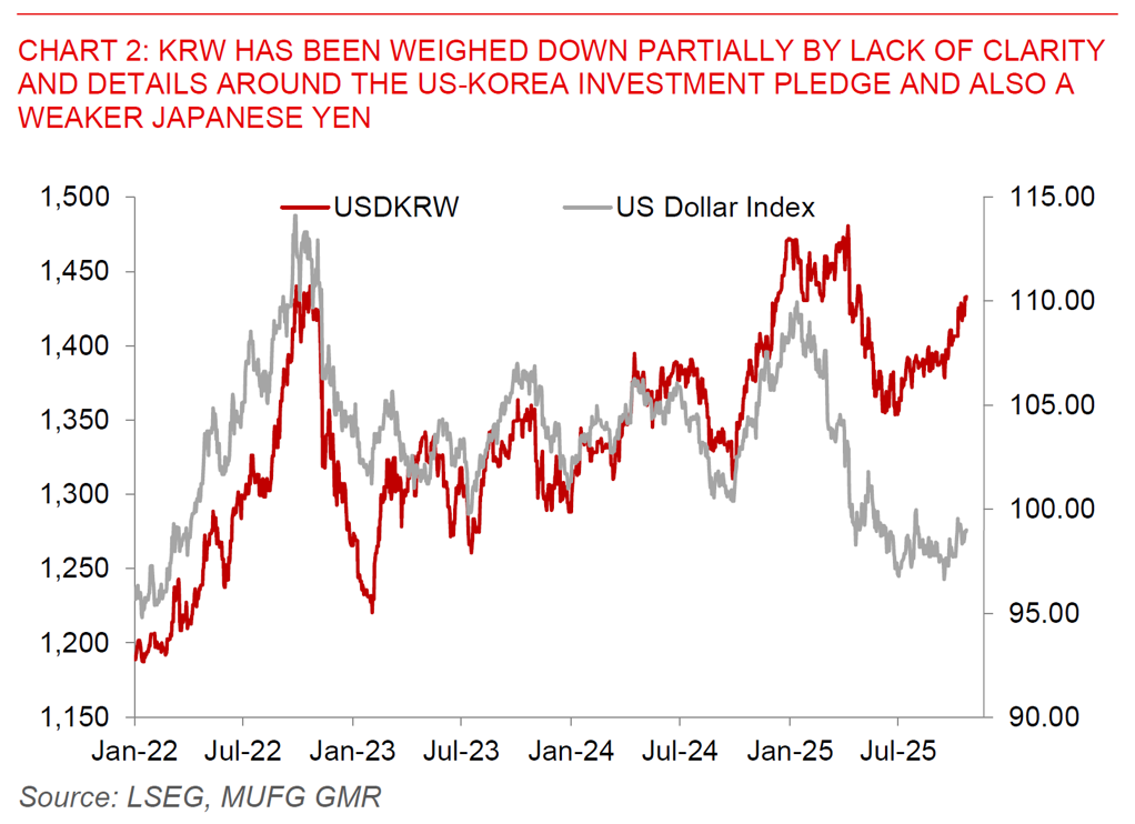 The Bank of Korea meets later today, and expectations are for a hold in the BOK policy meeting at 2.50%. Key for the markets would include the vote by the BOK Board members, with 5 out of 6 members in the August meeting thinking that a rate cut may be needed. In addition, the BOK will likely also closely consider the resurgence in housing prices and with that the government’s recent actions to cool the property market such as lowering loan-to-value ratios on the Greater Seoul area while implementing debt-to-service ratios. The potential FX impact to the South Korean won of current negotiations between the US and Korea on the investment deal package could also be important for the BOK. Latest news by Chosun suggests that discussions center around the structure of the US$350bn investment pledge, and the investment could be in phased payments of US$200bn over 8 years (~US$25bn annually), with US$150bn through credit guarantees. It is currently unclear whether the US$200bn over 8 years will be entirely in cash or if part of this could include loans.