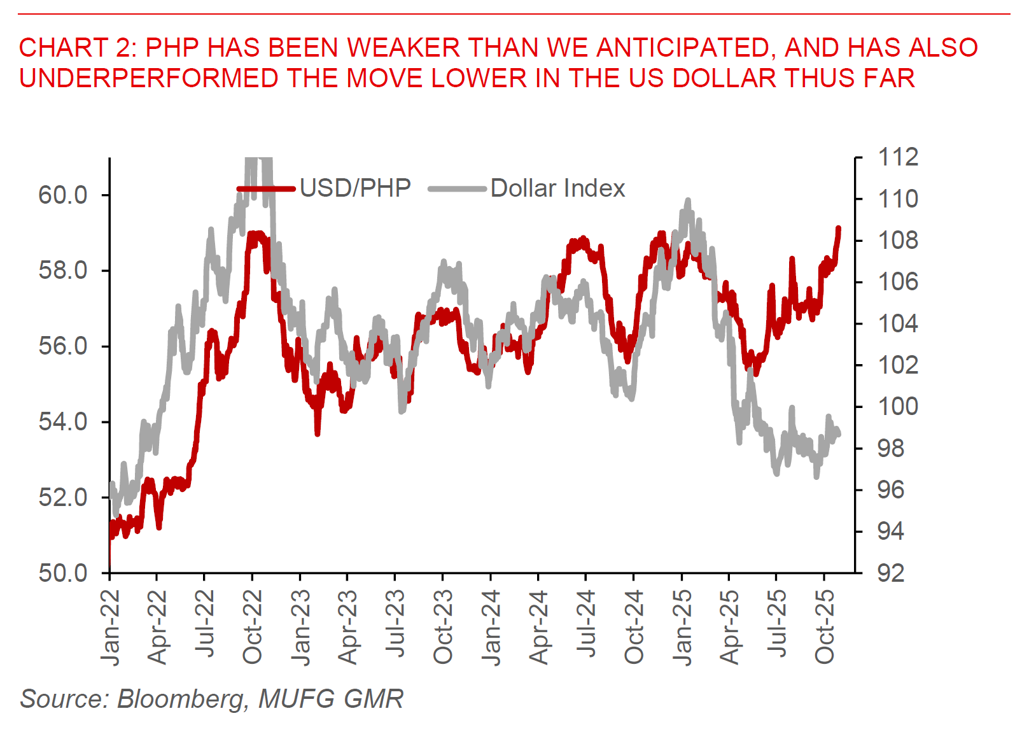 While we had already been anticipating some headwinds to PHP from a more dovish BSP, coupled with the corruption issues arising from flood control projects, the move in PHP has admittedly been weaker than we anticipated (see Philippines – BSP surprise rate cut with dovish tone. Shifting PHP forecasts weaker). We were expecting other offsetting positives such as lower inflation, strong private investment including in renewable energy projects, an expected pick-up in FDI from the past surge in FDI approvals, coupled with seasonal inflows from remittances to boost the PHP. Admittedly this has not happened yet. While we will relook our exact forecasts with our global team in the upcoming Global FX Monthly, we are not entirely comfortable abandoning our views for USD/PHP to move lower directionally, especially after the recent weakness.