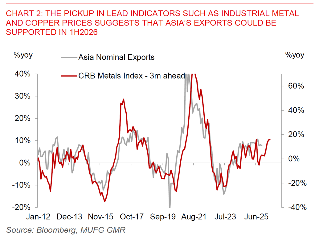 From our perspective and looking into 2026, we quite like the fact that metal prices continue to rise, even if driven perhaps by supply related issues at a micro perspective. Among many indicators, we find that metal prices are one of the best leading indicators of industrial and manufacturing activity across Asia, and with the recent pickup in copper and aluminum prices this should imply Asia’s export activity is supported at least into 1H2026 if the historical relationship holds.