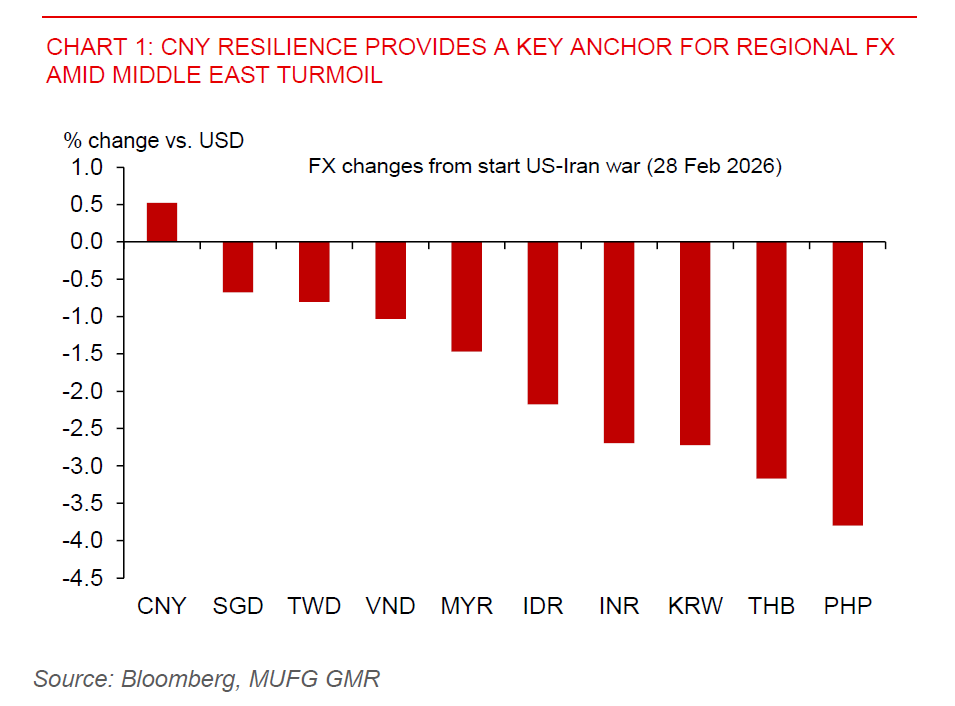 Despite ongoing Middle East turmoil, Asian FX has shown relative resilience. CNY, in particular, has strengthened by around 0.5% against the USD since the conflict began, underpinned by solid exports and continued PBOC support. SGD has also held up well, supported by MAS’s policy tightening and Singapore’s substantial macro and policy buffers. TWD continues to benefit from the global tech upcycle, a theme that should also lend some support to KRW and MYR at the margin.