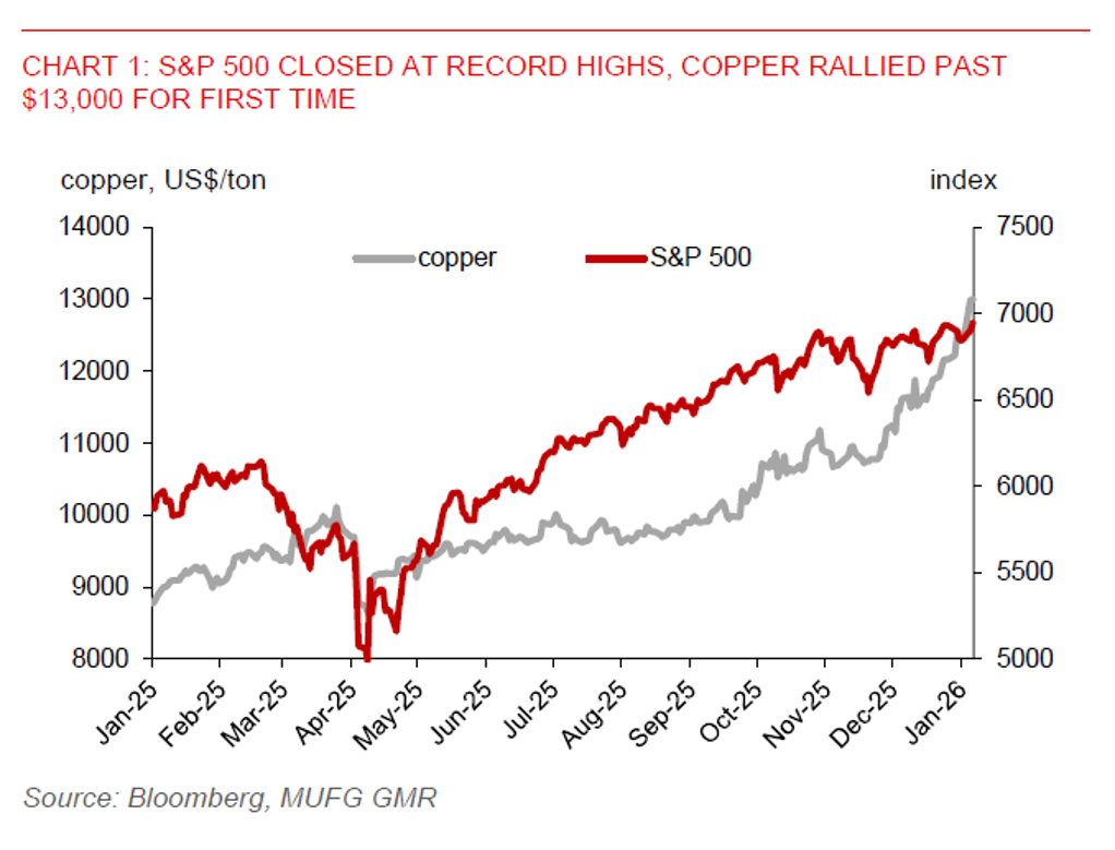 Markets kick off the year in risk-on mode, shrugging off geopolitical headlines such as US President Trump’s capture of Venezuelan leader Maduro. The S&P 500 closed at record highs, while industrial metals like copper and nickel rallied, signalling optimism around global growth. In Asia, the KOSPI surged to a new all-time high, buoyed by AI enthusiasm and strong Korean semiconductor export data for December.