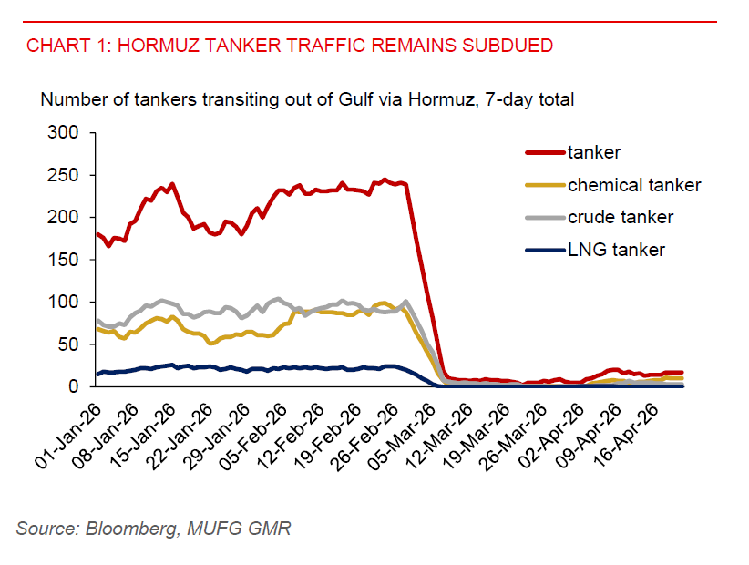 Markets are currently priced for de-escalation. But any escalation, particularly military action around Hormuz, could trigger a renewed spike in oil prices and a broad risk off move. The two-week US–Iran ceasefire expires on Wednesday. The key question for markets is whether President Trump delivers another “TACO” outcome - extending the ceasefire or de-escalating tensions - or instead up the ante. President Trump has signalled he is unlikely to extend the ceasefire, while the US blockade of the Straits of Hormuz, aimed at restricting Iranian oil exports, could remain unless a deal with Iran is reached. With conflicting signals on whether Iran will engage in further peace talks and no formal timeline set, outcomes remain binary. Hormuz tanker traffic also remains subdued.