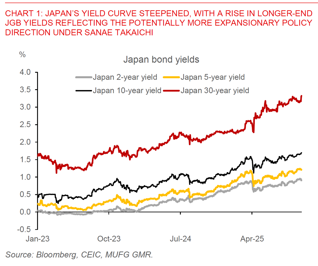 Political risks remained front and center of markets this week, first in Japan and more recently in France. The impact of the Japan’s LDP Elections with Sanae Takaichi likely the next Prime Minister continued to play out in markets, with the Japanese Yen weakening above the 150 level, the Nikkei surging more than 4%, and the JGB curve steepening with longer-end yields rising around 15bps. The policy direction by Takaichi-san seems to be for at least some modest fiscal expansion with proposals to cut gasoline taxes, and to also delay (albeit not deny) Bank of Japan rate hikes. Close economic advisors such as Etsuro Honda and Takuji Aida were quoted as saying that Takaichi-san would probably tolerate another rate hike either December or January, with unclear paths beyond that. Meanwhile, JPY received some temporary reprieve when local media reported that she may give key posts to veteran former finance Ministers, and potentially signalling that she will not ignore fiscal concerns. While only time will tell, in the very near-term the bias for steeper JGB curves, expectations of reflationary policies benefiting Japanese equities, and underperformance in the Japanese Yen may continue.