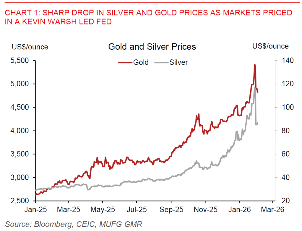 Markets made some violent moves as confirmation of a Kevin Warsh led Federal Reserve led to a repricing of risk assets together with a stronger Dollar. In particular, silver prices fell sharply by close to 30% in a move for the history books, while gold, copper and several other commodities also fell meaningfully. The US Treasury yield curve twist steepened, with US 10-year yields rising to 4.27% at one point while front-end yields fell.