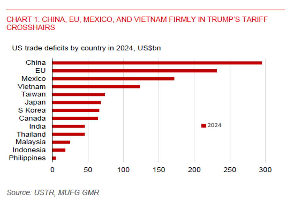 Elsewhere, we have downgraded our 2025 growth outlook for Thailand to 2.2% from 2.8% previously following the earthquake, which could hurt the tourism industry. The Thai Hotels Association has predicted that visitor arrivals could decline by up to 15% or possibly more in the next couple of weeks. Thai baht has been resilient so far against the US dollar, but this may not last, given a weaker outlook for domestic growth, likely lower visitor arrivals in the coming months, and potential reciprocal tariff hikes (see Thailand: Growth outlook downgraded after the earthquake, baht to weaken). Meanwhile, we think Singapore won’t be directly targeted by Trump. But given it is a major transshipment hub, the SGD is still highly exposed to higher global tariffs and a slowdown in world trade.