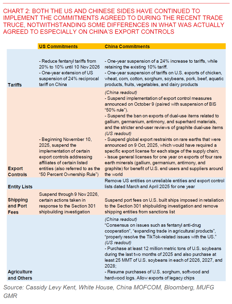 The other piece of positive news is the ongoing implementation of the US-China trade truce that was agreed to recently. We saw a range of announcements yesterday by both the US and Chinese side, and most importantly the suspension of the BIS 50% affiliate, and from the Chinese side moves to suspend port fees and also impose control on fentanyl related drugs. There remains some key differences in interpretation between both sides and in particular on China’s export control measures, but the totality of moves seen suggest good faith implementation of the trade truce for now.