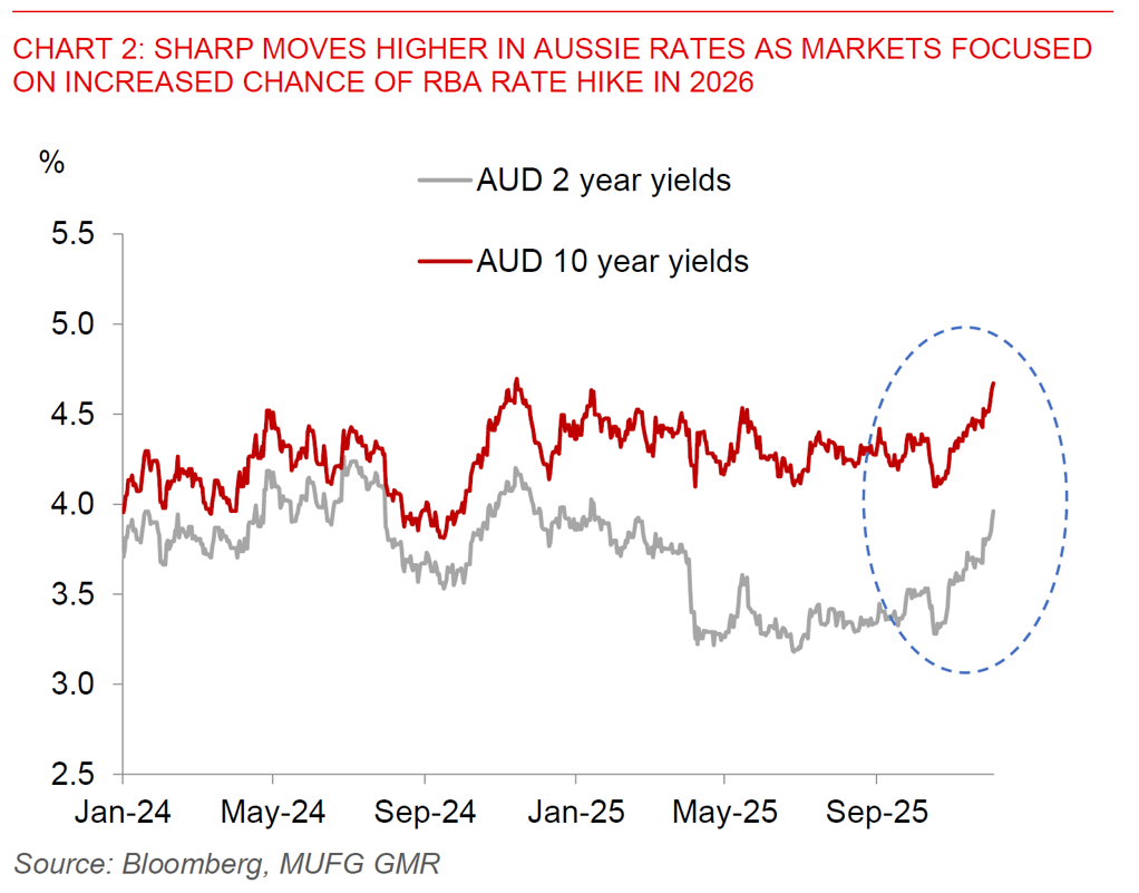 Across our region, we saw a continued rise in Aussie rates (and to a lesser extent this spilled over to FX as well), coupled with continued weakness in the Indian Rupee. In particular, the Australian dollar and bond yields rose, after initially dropped on slower than expected GDP print, as details showed that labour costs steady elevated coupled with nominal growth indicators suggesting that inflationary worries by the RBA is justified. Aussie OIS rates markets are now pricing for the 1st RBA rate hike as soon as the August 2026 meeting, from December previously, and also highlighting how central bank policy divergence and with that FX performance could become a more important theme heading into 2026. AUD/USD rose up above the 0.661 level on the back of these developments.