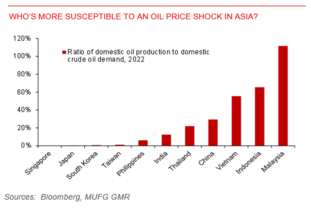 Market sentiment has quickly turned sour on Asian currencies amid rising geopolitical tensions in the Middle East. THB (-3%), IDR (-2.7%), MYR (-1.1%), led losses in the region so far this week, partly on the back of a recent rally that’s looking stretched, especially for the MYR and THB. With no signs of a step-down in tensions between the two, geopolitical tensions in the Middle East will likely continue to dominate market sentiment. The key risk is that miscalculations by either parties could lead to a broader reginal conflict, increasing global risk aversion. In particular, a major retaliatory strike by Israel on Iran’s oil exporting facilities would severely disrupt global oil supplies, pushing up oil prices sharply. The key implication on Asian economies would come from a spike in oil prices, like what we saw during the Ukraine-Russia conflict. Except Malaysia, which is a net oil exporter, an oil price shock would hurt many Asian economies, given their high reliance on oil imports. Economies with limited domestic production of crude oil, and thus have a high reliance on oil imports for their energy needs, will be disproportionally vulnerable. These economies include Singapore, Japan, South Korea, Taiwan, Philippines, and India.