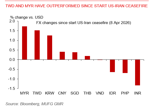TWD and MYR have outperformed since start US-Iran ceasefire