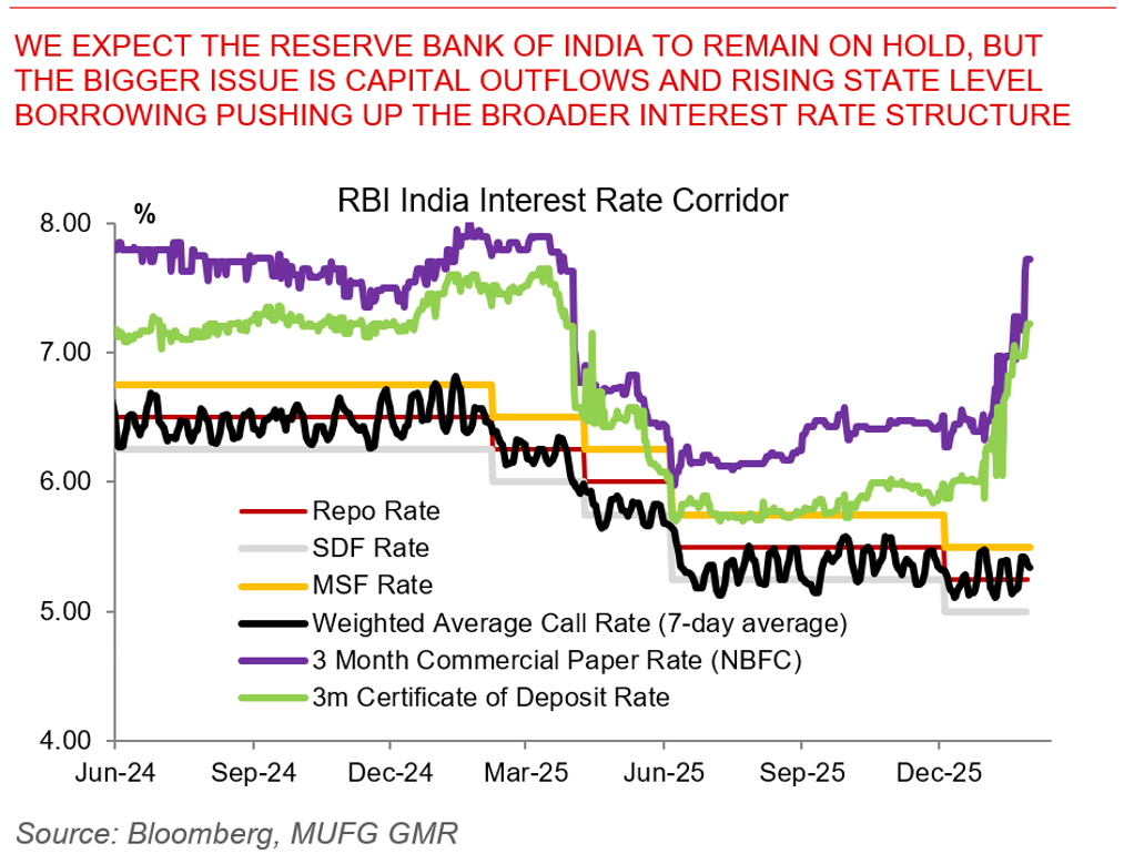 We expect the Reserve Bank of India to remain on hold, but the bigger issue is capital outflows and rising state level borrowing pushing up the broader interest rate structure