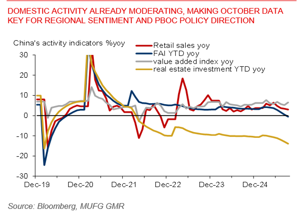 Domestic activity already moderating, making October data key for regional sentiment and PBoC policy direction