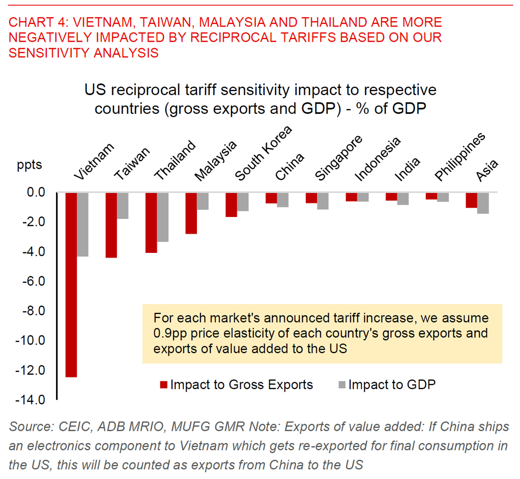 - Vietnam, Taiwan, Thailand, Malaysia and Singapore are likely more vulnerable from reciprocal tariffs, while India and the Philippines are relatively more insulated. For example, Vietnam could see a very sharp 12pp reduction in gross exports to the US as a share of its GDP, and potentially up to 4pp reduction in its GDP.