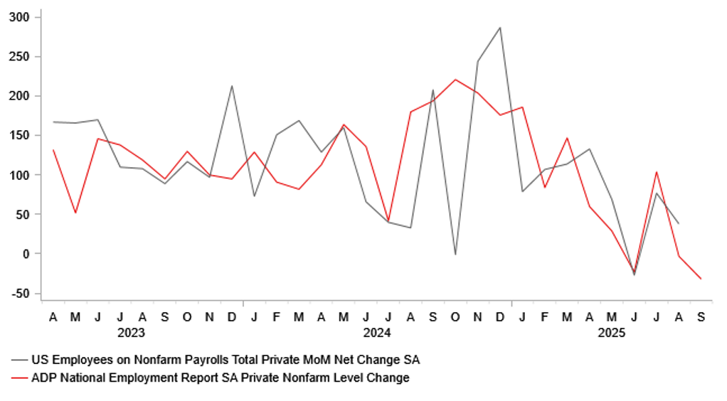 The release of the ADP survey yesterday had more market impact than normal given that the nonfarm payrolls report for September is likely to be delayed due to the government shutdown which will limit further insights into the health of the US labour market. In recent months the ADP survey has provided a closer estimate of nonfarm private employment growth overestimating by an average of around 19k in July and August. Overall, the current estimate for September of -32k does suggest that employment growth remined weak even if the ADP survey is not always the most reliable forward indicator.