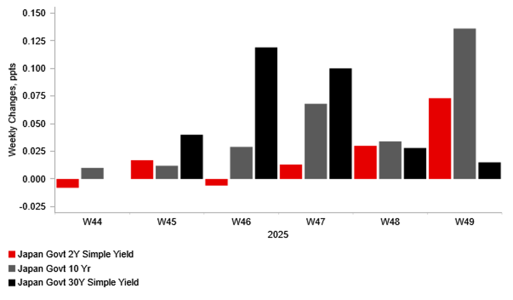 The Bloomberg report overnight has encouraged the Japanese rate market to almost fully price in a BoJ rate hike this month lifting short-term yields in Japan. The 2-year JGB yield has risen by a further 3bps overnight bringing the cumulative increase for this week to 7bps. The sharp move higher in short-term yields has reinforced the sell-off at the long-end of the JGB curve that had been triggered over the past month by concerns over looser fiscal policy in Japan including the government’s bigger extra budget. There has been some divergence in performance between the long and super long-end of the JGB curve. The 10-year JGB yield has jumped by around 14bps this week while the 30-year yield is up by only around 2bps. The 30-year JGB yield has been adjusting lower at the end of this week after yesterday 30-JGB auction revealed the strongest bid-to-cover ratio since 2019 indicating higher yields are becoming more attractive for investors. When asked about recent moves in JGB yields overnight at a news conference, Finance Minister Katayama stated they continue to monitor developments closely and make sure market trust isn’t lost. She emphasized that “we are, of course, giving due consideration to fiscal sustainability in the budget drafting” for the next fiscal year. The comments tentatively indicate that continued upward pressure on government borrowing costs could curtail the government’s plans for looser fiscal policy. A development that would help to ease downside risks for the yen next year alongside continued BoJ policy tightening.