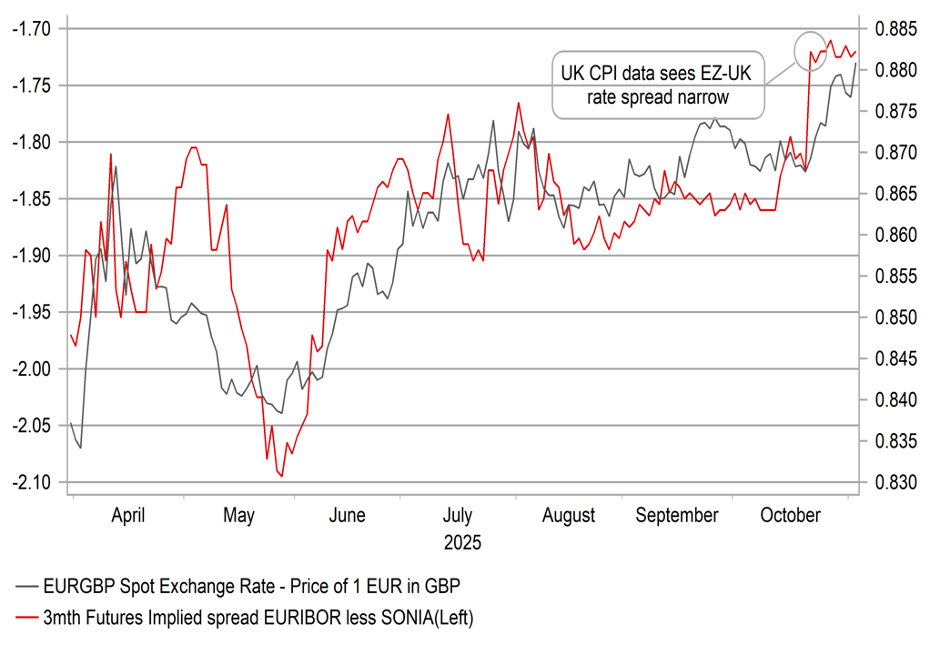 If the fiscal hole is smaller than expected, it is certainly feasible that the budget could then raise enough revenues to build a larger fiscal headroom while also avoiding a breach of the key election manifesto promises. It might therefore be that the negativity related to the budget pushing Gilt yields and the pound lower could become overdone. It also highlights why the BoE is likely to hold off from cutting this week given the uncertainty related to the outcome of the budget is high and by the December BoE meeting the MPC will be able to fully assess the budget and will have two CPI and jobs reports to hand as well. In the meantime though, the pound is likely to continue to underperform on the expectations of a harsh budget. The rates market pricing implies a 30% probability of a cut tomorrow.
