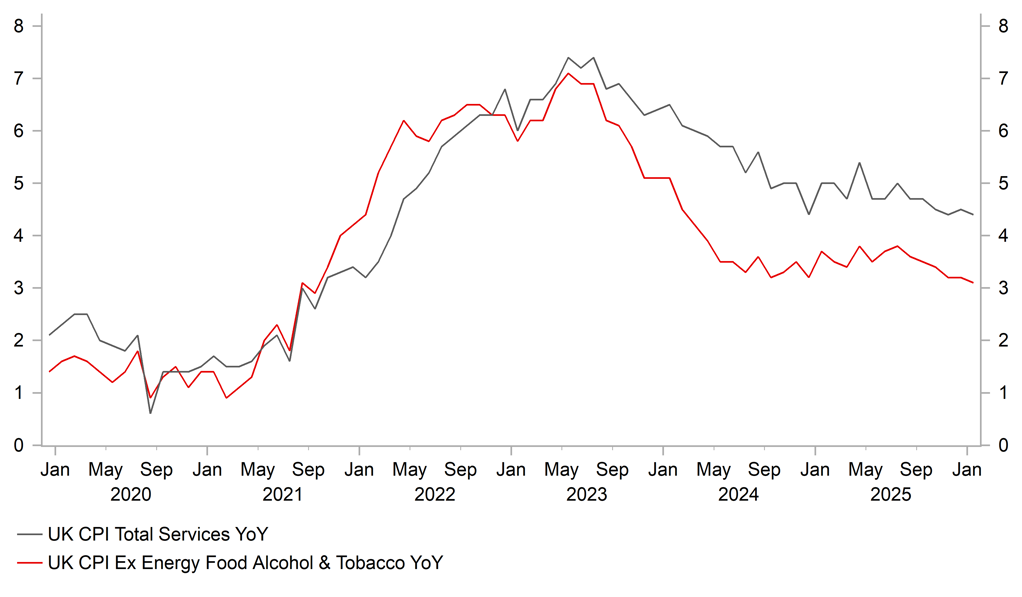 UK inflation data for January has just been released in the UK and the data has come in a touch stronger although the miss versus consensus is unlikely to be enough to prompt any notable FX or rates move. The YoY headline CPI rate dropped 0.4ppt to 3.0% as expected but the core and services CPI rates were both 0.1ppt higher than expected (at 3.1% and 4.4% respectively). But the disinflation momentum is still evident in today’s data and after the weak jobs data yesterday we would still argue that the BoE is on course for cutting by 25bps in March. Today’s data is important in that context as the February CPI data is released later than usual (on 25th March) and therefore will be after the March MPC meeting (on 19th). The jobs data will be released on the day of the MPC meeting although a vote and decision is often agreed the day before. But access to the jobs data will likely be made available. Still, with this the last CPI print before that meeting, the YoY services CPI at 4.4% is well above the BoE’s projection of 4.1% providing continued evidence of sticky underlying inflation. Pricing for a 25bp cut at that meeting could well slip a little after this CPI data which should provide some support for the pound after the sell-off yesterday. We are though maintaining our view that there is enough data available to justify a cut in March.