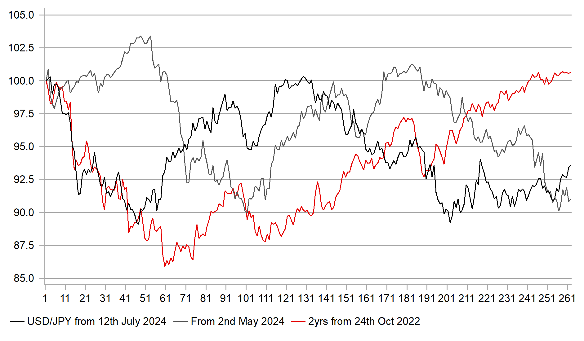 The three episodes of intervention in the most recent periods (Oct 2022; May 2024; and July 2024) all faded over time and that is primarily down to the fundamental backdrop being consistent with yen weakness. A BoJ that remains sidelined as inflation moves higher will be another signal that the fundamental backdrop hasn’t changed.