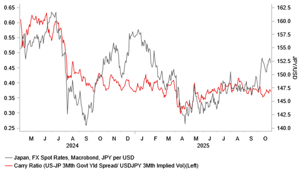 Governor Ueda also emphasized that if convinced, the BoJ will adjust rates regardless of politics although stressed he plans to work closely with the new government. It follows a recent post from US Treasury Secretary Scott Bessent calling on the new government to allow room for the BoJ to continue to normalize policy. The comments support our view that the BoJ will continue to raise rates gradually under new Prime Minister Takaichi. However, the BoJ’s policy update overnight indicates that they are in no immediate rush to resume rate hikes encouraging a weaker yen. The probability of a rate hike by December is currently priced at around 50:50 despite no strong signal at today’s meeting.