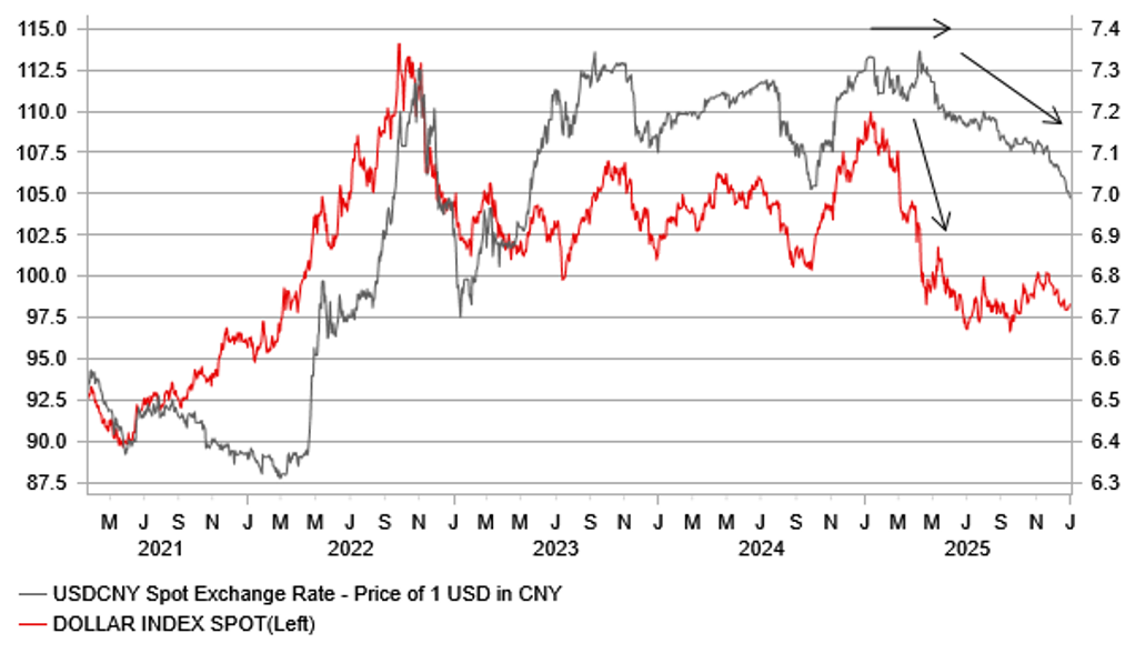 The recent acceleration in renminbi appreciation is drawing increased market attention as we head into 2026. USD/CNY is on track for its seventeenth consecutive daily decline and has broken below the 7.000 level for the first time since May 2023. The PBoC has also been setting progressively lower daily fixes, with the latest at 7.0288, signaling that policymakers are now more comfortable allowing the renminbi to strengthen against the U.S. dollar after maintaining stability earlier in the year. By keeping USD/CNY stable during the sharp U.S. dollar sell-off earlier this year, the trade-weighted renminbi weakened significantly, boosting China’s export competitiveness. The CFETS renminbi index fell about 6.7% between January and July but has since rebounded by roughly 2.5%.