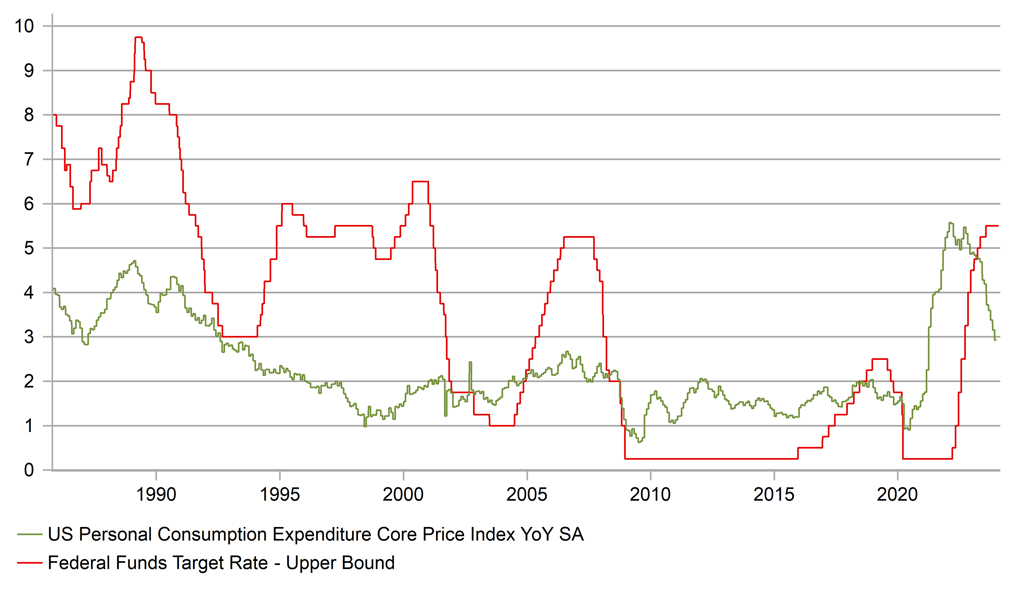 The first FOMC meeting of 2024 is upon us and with the outcome of the meeting clear – an unchanged policy – the guidance will be everything, from the statement to particularly the press conference. So what has taken place since the last meeting that could help shape the communication from the FOMC and Powell this evening? The S&P 500 has advanced by 6.0%; the 2yr UST note yield is down 37bps and the 10-year yield is 13bps lower. The Bloomberg IG Corporate bond index is 2% stronger and the US dollar has weakened by about 0.5%. Clearly, financial conditions have eased markedly.