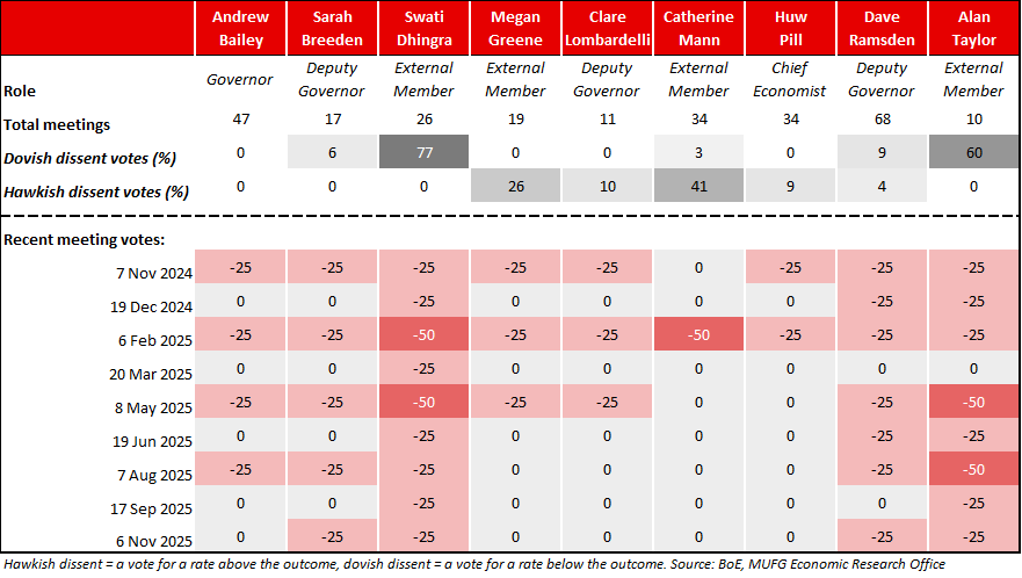 Chart is based on textual sentiment analysis of individual MPC members’ commentary in the BoE’s minutes of the November 2025 meeting. Source: Bank of England, MUFG GMR