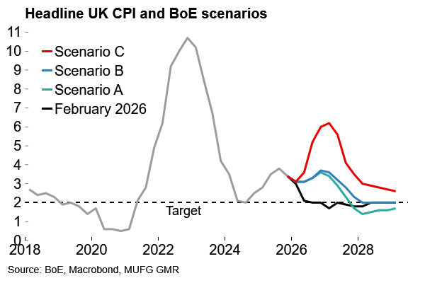 In our preview, we wrote that the BoE would likely downplay the significance of its updated central projections and instead focus on a range of scenarios given elevated uncertainty. At the finish, no central projection was presented at all, with three scenarios (A, B and C) laid out instead: “In Scenario A, energy prices were assumed to follow market futures curves, while in Scenarios B and C, these were higher and more persistent than the futures paths to varying degrees.”
