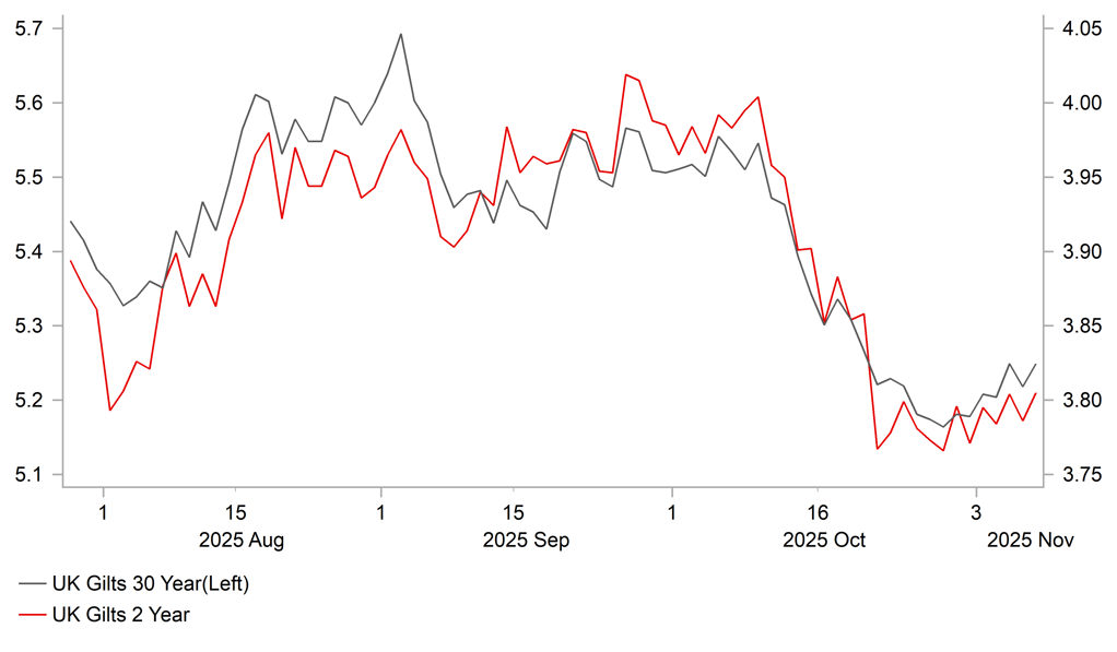 So we still see scope for this easing of dollar buying momentum turning back to dollar selling. If EUR/USD was to trade to the mid-1.16 level by end-Nov, the seasonal bias that strongly favours higher EUR/USD in December makes our 1.20-level still achievable. The OIS market shows 17bps of cuts for the December FOMC and a fed funds of 3.08% by October 2026. We see scope of that level being achieved more quickly and weak payrolls data and renewed economic uncertainty fuelled by another bout of trade uncertainty would likely see a renewed drop in US yields. The failure of dollar gains to extend after the DXY technical break this week is a bearish signal.