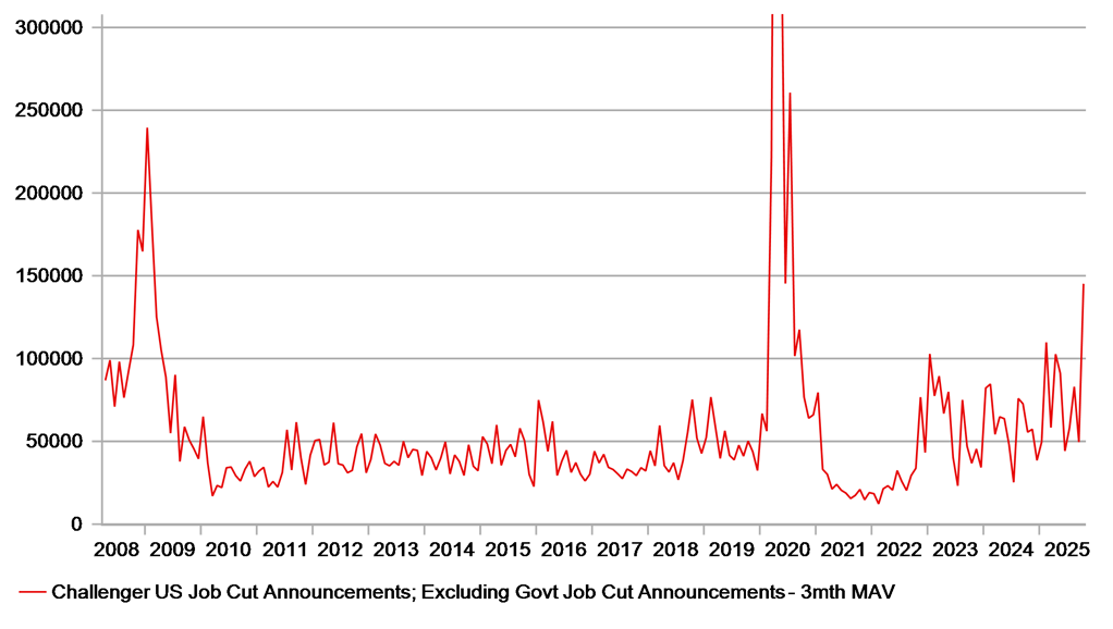 The 2-year UST bond fell 8bps yesterday, primarily on the back of the Challenger Job Cut Announcements data that revealed job announcement cuts of 153k in October – that was the largest October increase since 2003. On a year-to-date basis, Challenger data shows close to 1.1mn job cuts have been announced in 2025, which when 2020 is excluded is the largest over the Jan-Oct period of any year since 2009 during the Global Financial Crisis. Furthermore, when the data is viewed excluding the impact of DOGE and government sector job losses, it paints an even worse picture. Excluding government job cut announcements, the total surged to 145k in October, by far the worst total of any month since 2009 during the GFC when 2020 is excluded. What else can we garner from private sector data? The ISM employment reading remain below the key 50-level for manufacturing and services but the contraction has been diminishing. Indeed job advertisements data also indicates a weakening trend. Looking at the data on a weekly basis, the 4-week average hit a new low in October, hitting levels not seen since 2020. Revelio Labs – another private sector employment data source (using HR and payroll data) – revealed a 9.1k drop in employment in October, down from a 33k gain in September. It was the second drop in 2025 (other was May) although this data set only began in Feb 2021 so there is not much historical context. ADP did reveal a rebound in October (42k vs -29k in Sept) so while the data is somewhat mixed, the private sector data overall does clearly still point to continued weakness in employment and a pick-up in firing. Once the NFP data is released after this government shutdown ends, we see it as more likely the official data will continue to reveal a weakening trend in jobs growth.