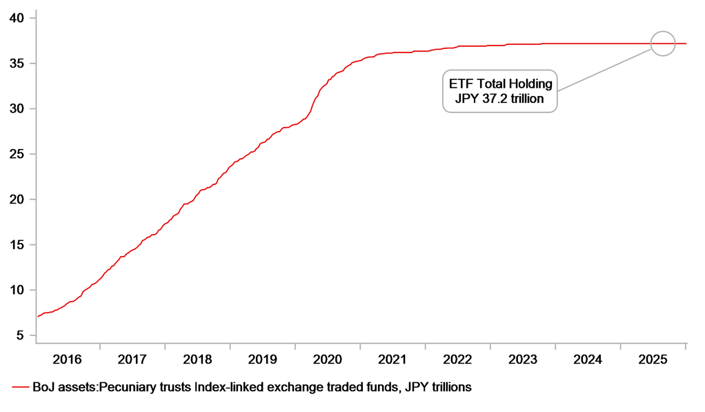 Today also saw the commencement of BoJ ETF sales that had been previously announced at the September 2025 policy meeting. Then the BoJ reported book value holdings of JPY 37.1trn and a market value of JPY 83trn. The plan is to conduct sales at a very slow pace – just JPY 330bn per year, implying that this would take around 112 years to complete. Still, these sales will help from a government fiscal position standpoint with sales locking in a handsome profit after strong equity market gains in recent years. Bloomberg estimates that first-year sales will realise about JPY 1.4trn in profit that equates to about 1.7% of planned government revenues.